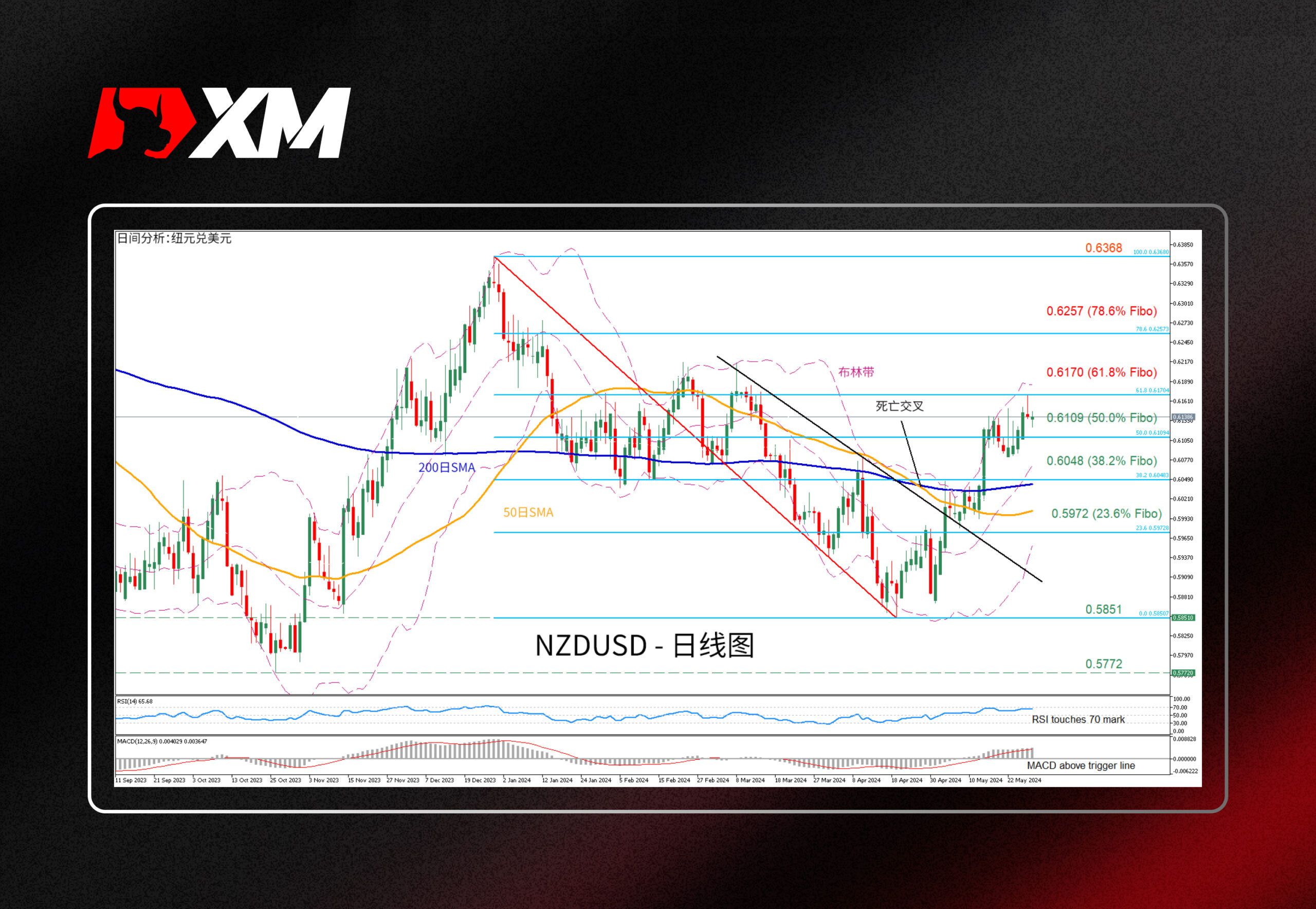 NZDUSD在4月中旬创2024年低点0.5851后一直处于强劲上升趋势 。汇价突破50日和200日移动平均线(SMA) ,同时动量指标也倾于上行,证实短期前景看涨。